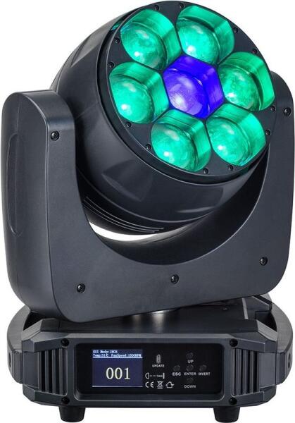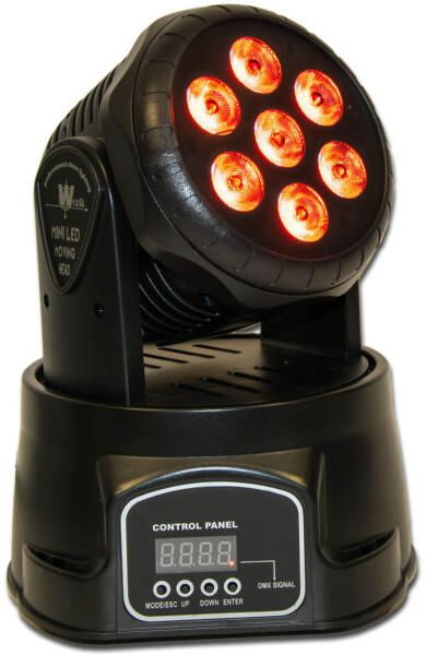 Műszaki adatok: - 7x15W RGBW Led fényforrás - Sound / Auto / DMX / Master-Slave módok - 9 és 14 DMX csatorna - Szabályozható fényerő és szín, stroboszkóp - Aktív hűtés - Gyors és halk mozgás - Tápellátás: AC110-220V 50/60Hz - Méret: 18x18x25 cm - Tömeg: 2,7 kg Termékleírás: A Thunder MHD-15B robotlámpa 7 db négy színű (RGBW) és nagy fényerejű LED fényforrásokkal s