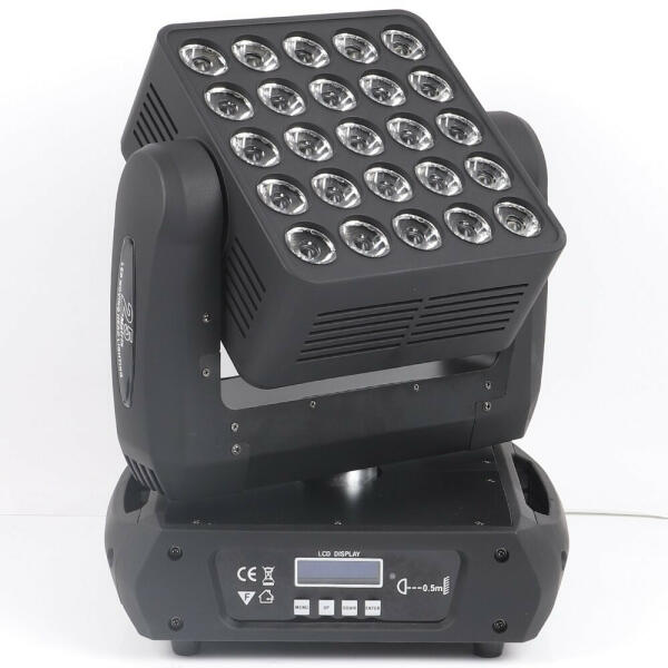 LED Matrix 25x12W műszaki paraméterek: - Feszültség: AC100-240V 50/60Hz. - Áramfelvétel: 500 Watt. - Tanúsítvány: CE és ROHS, WEEE, SAA. - LED forrás: 25db amerikai importált CREE 12W RGBW 4in1 LED forrás. - Pan/Tilt: végtelen fok, végtelen forgás. - Funkció: DMX, Hang aktiválva, Auto, Villogó, Master/slave. - DMX: DMX-512 19/29/117 csatorna. - Inno program: 32 dinamikus minta -