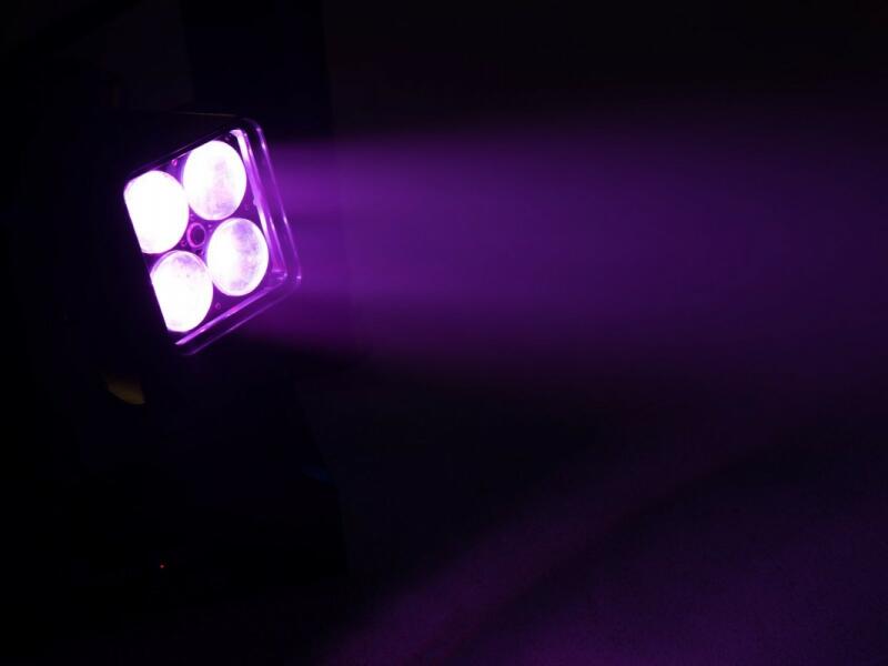 Wash robotlámpa, 4x9W RGBW LED, Zoom - LED-es RGBW Wash robotlámpa - 4x9 Wattos RGBW QCL ledek - Vezérlés: DMX, Stand Alone, Master/Slave, Hangvezérlés - Opcionális vezérlés USB-n keresztül: QuickDMX, W-DMX, CRMX by LumenRadio - DMX: 15 csatorna - 4 gombos LCD kijelző - 6 - 40 fokos motorizált zoom - 16 bites Pan/Tilt mozgás (540 és 220 fokos mozgás) - Elektronikus dimmerelhetőség