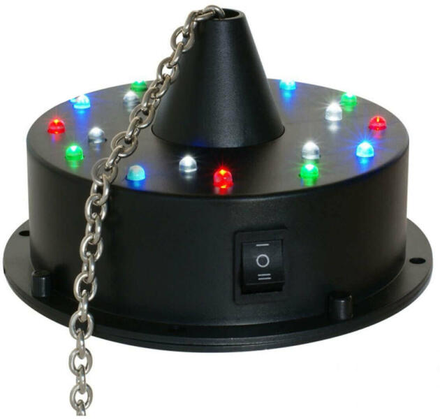 Műszaki adatok: - LED-es megvilágítás - LED-ek száma: 18 db RGBW - 4 különböző LED szín - 4xPiros, 4xZöld, 4xKék, 6xFehér - Maximális teherbírás: 2 kg - Beépített lánc hossza: 20cm - Forgási sebesség 3-4 fordulat /perc - Tápellátás: 3 x AA ceruza elem/akku - Átmérő: 8,5 cm - 11cm - Magasság: 4,5 cm - Tömeg: 0,2 kg - Nagyon praktikus, könnyen felszerelhető termék Ter