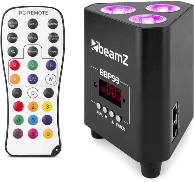 Műszaki adatok: - 3x 10 W 4 az 1-ben RGBW LED - Akár 7 óra üzemidő - Gyors töltési idő, mindössze 3 óra - DMX és önálló mód - 8 DMX csatorna - Automata üzemmód állítható sebességgel - Master/slave szinkronizálás - 0-100% elektronikus fényerő-szabályozó - DMX be/kimenet RJ45-ön keresztül - Választható sebességű Strobe - Választható színhalványítás - IR távir