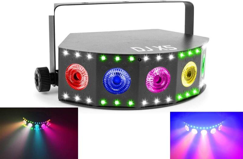Műszaki adatok: - LED fényforrások - 5x 10W RGB-UV LED (Red - piros, GREEN - zöld, Blue - kék, UV) - 30x SMD RGB LED - Hangvezérelt, beépített mikrofonnal rendelkezik - Automata funkció - DMX és Master/Slave mód - 1, 4 és 20 DMX csatorna - Távirányító - Szabvány IEC csatlakozás input/output - Színek külön-külön állíthatóak - 100.000 óra LED élettartam - Fém ház - Mér