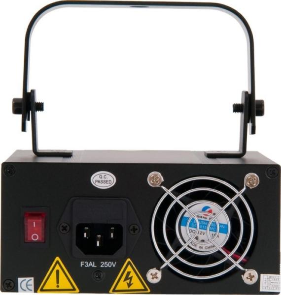Egyszínű lézer effekt, zöld 60mw. - Lézerforrás: Léghűtéses zöld dióda, 40mW / 532nm - Dióda élettartama: Kb. 10.000 óra - Működési módok: Automata- és hangvezérelt - Eltérítőrendszer: Nagysebességű léptetőmotor - Áramfelvétel: 20 Watt - Méretek: 235 x 145 x 70mm - Tömeg: 3 kg