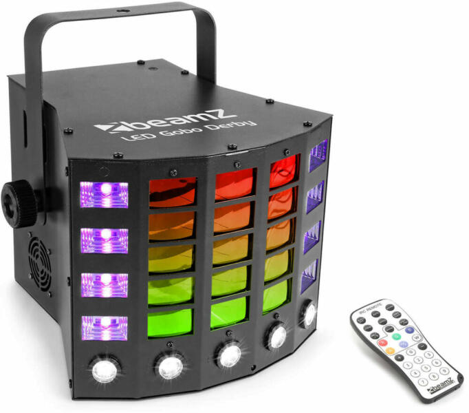 BeamZ Gobo Derby (8x3W) RGBA 15 optikás + UV + Stroboszkóp DMX derby fényeffekt Hivatalos magyarországi forgalmazótól. Leírás: A BeamZ Gobo Derby egy nagy fényerővel rendelkező DMX vezérléses, sok funkcióval ellátott fényeffekt. 15 kilépő gobo-s optikája mellett 6 db extra nagy teljesítményű UV LED, valamint 5 db nagy teljesítményű fehér LED is található rajta. A ledek
