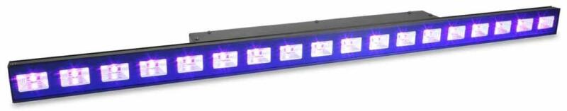 BeamZ LCB48 UV (3W) DMX LED bar fényeffekt Hivatalos magyarországi forgalmazótól. Leírás: Erős és nagy teljesítményű LED-sáv, ultraibolya LEDekkel. Ezek a LEDek 6 külön vezérelhető szegmensre vannak osztva, így lehetőség nyílik kifutópálya-effektek létrehozására. IEC be-/kimenettel felszerelve több egység összekapcsolásához. Műszaki adatok: – 18x 3W UV LED – Para
