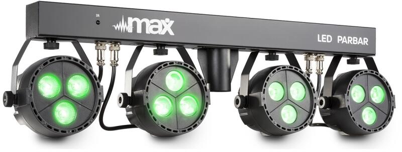 Műszaki adatok: - 4 Way kit with 3x 3W 4-in-1 LEDekkel - RGBW (Piros, Zöld, Kék, Fehér) - Hangra színek váltása, villogtatása - Automata vezérlés állítható sebességgel - LED kijelző - Masszív összeszerelés - DMX be/kimenet 3 tűs XLR-en keresztül - Tartozék állvány - 8 DMX csatorna - Távirányító - Méret: 735 x 200 x 90mm - Tömeg: 7,25 kg Termékleírás: 4 Led PAR-ból