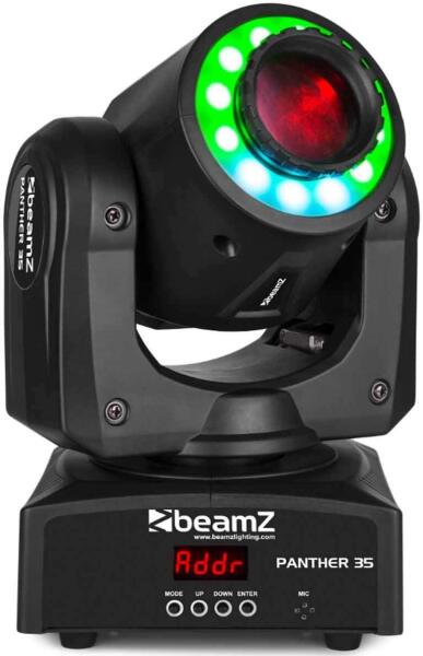 Műszaki adatok: - 35 W fehér LED és 12 x 0,5 W RGB SMD LED - Gyűrűs színkeverés: RGB, csoportos vagy egyéni vezérlés (4 szekció) - Színkerék: 7 szín + nyitott, szivárvány és flow effektus - Gobo kerék: 7 Gobos + nyitott, gobo/flow effektus és gobo shake - 9 vagy 11 DMX csatorna - Manuális fókusz - 11°-os sugárzási szögű objektív - DMX, automatikus program vagy önálló