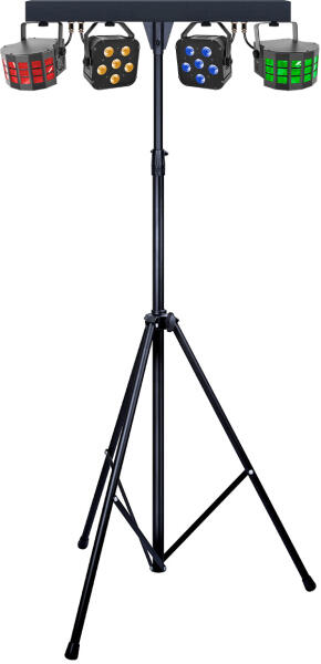 Műszaki adatok: - 2x PAR 6x 4W RGBW LED PAR - 2x Derby 10W RGBW LED - RGBW (Piros, Zöld, Kék, Fehér) - Hang vezérelt, beépített mikrofonnal rendelkezik - Hangra színek váltása, villogtatása - Automata vezérlés - Tartozék állvány - Távirányító - Teljesítmény: 55 W - Méret: 60 x 60 x max. 240 cm - Tömeg: 6 kg Termékleírás: A Thunder PARTYBAR202 fényeffekt szett kettő LED