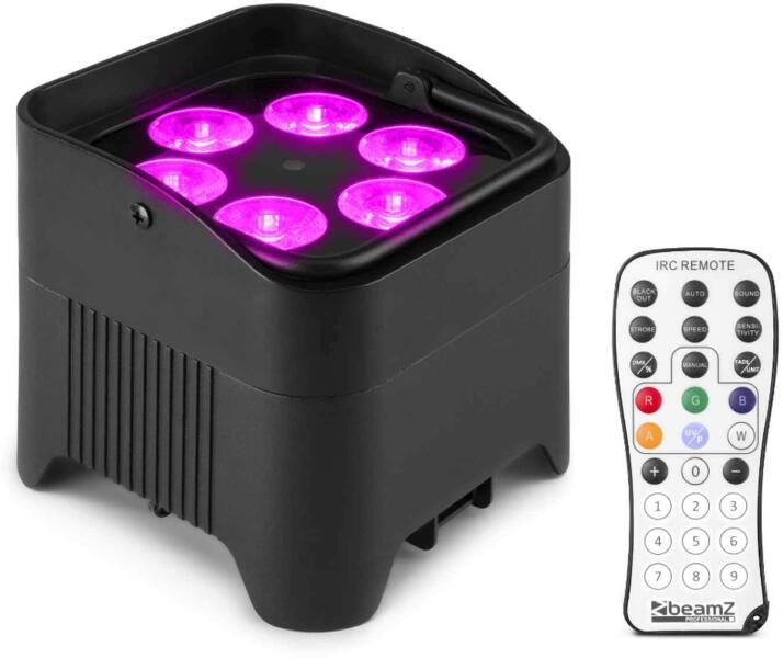 Műszaki adatok: - 6x 12W-os 6 az 1-ben RGBAW-UV LED - Beépített vezeték nélküli DMX vevő - Integrált összecsukható láb - Akár 9 óra üzemidő - Gyors töltési idő mindössze 3 óra - DMX és önálló mód - 6 vagy 10 DMX csatorna - IR távirányító - Automata üzemmód állítható sebességgel - Master/slave szinkronizálás - 0-100% elektronikus fényerő-szabályozó - DMX be/