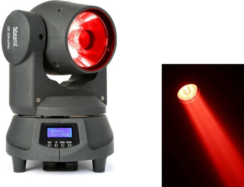 Műszaki adatok: - 1x60W Led fényforrás - Fej mozgás: 540° - Fej billenés: 220° - Sugárzási szög: 4° - DMX csatornák: 14 - Állítható stroboszkóp sebesség - Állítható 0-100% fényerő - PowerCon be/kimenet - Gyors mozgás - Vezérlés: Automata, DMX - Fogyasztás: 85W - Méret: 20,5 x 19 x 29 cm - Tömeg: 4,2 kg Termékleírás: A BeamZ Panther 60 beam robotlámpa, 4 különböz