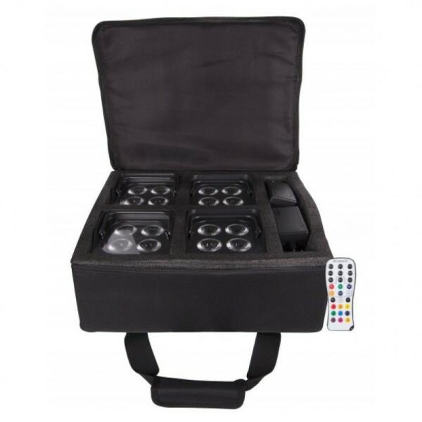 Akkumulátoros PAR lámpa, 4db 12W RGBWA+UV A hordtáska nem tartozék! - 4x 12W RGBWA+UV - Led átlagos élettartama: 50.000 óra - Vezérlési mód: DMX512, Master/Slave, önálló, vezeték nélküli DMX, infravörös távirányító DMX csatorna: 6CH / 10CH - Vezérlőpult: LED kijelző - Bemeneti teljesítmény: 100-240VAC 50/60Hz - Áramfelvétel: max. 55W - Akkumulátor típusa: Újratölth