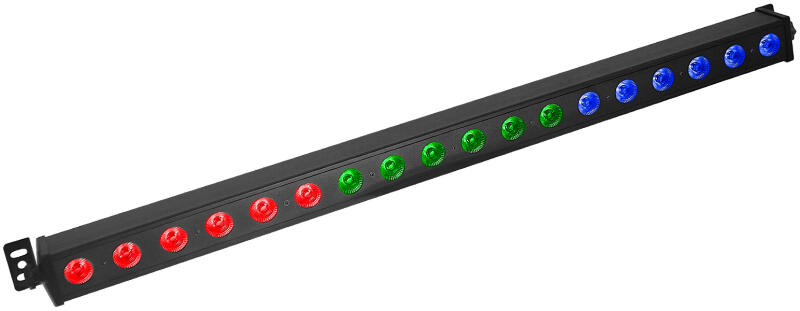 Műszaki adatok: - 18x 3W RGB LED - RGB (Piros, Zöld, Kék) - Előre beállított színek - Előre programozott effektek - Elektronikus fényerő szabályzás: 0 - 100% - Sugárzási szög: 40° - DMX csatornák: 3/7/13 - Hangvezérlés - Stroboszkóp üzemmód - Master/slave funkció (egymást vezérli) - DMX be/kimenet 3 tűs XLR-en keresztül - Tápcsatlakozó: IEC bemenet/kimenet - Tápellát