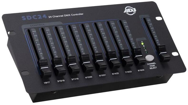 Az ADJ Lighting SDC24 egy alapvető 24 csatornás DMX vezérlő, amely külső 12 VDC tápegységről (tartozék) vagy 9 VDC elemről (nem tartozék) működik. Az SDC24 rendelkezik 5 és 3 tűs DMX kimeneti aljzatokkal, DIP kapcsolókkal a kezdő DMX csatorna beállításához, fő dimmer faderrel, be-/kikapcsolóval és jelző LED-ekkel ellátott Channel Page gombbal. Ez egy nagyszerű kompakt v