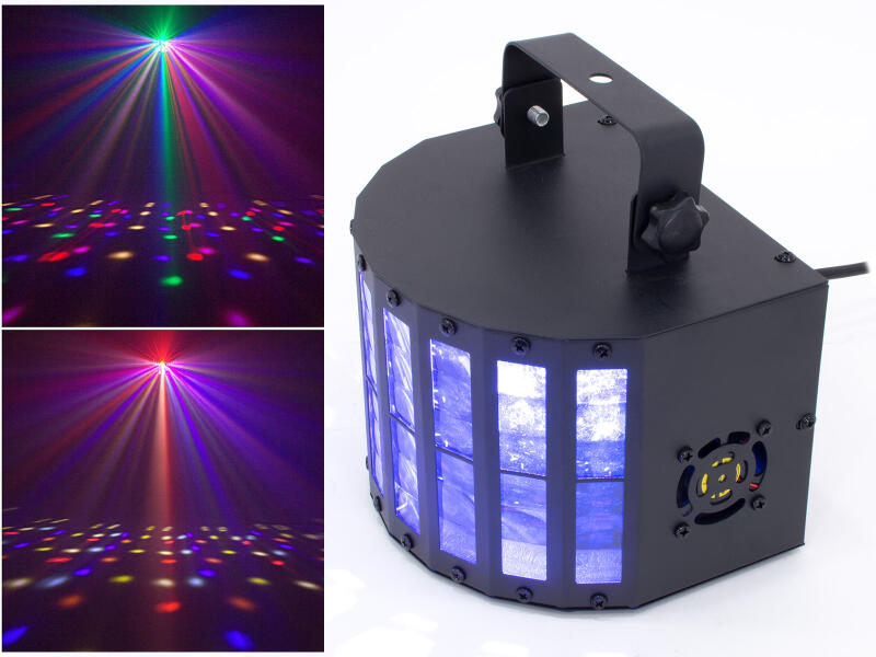 Műszaki adatok: - 9 x 3W nagy fényerejű LED - RGBAWPROY színkeverés (Red – piros, GREEN – zöld, Blue – kék, Amber – borostyán, White – fehér, Purple – lila, Rose – rózsa, Orange – narancs, Yellow – sárga) - 6 x 8 fénycsóva - 8 DMX csatornán vezérelhető - Hang vezérelt, beépített mikrofonnal rendelkezik - Hangra színek váltása, villogtatása - Automata vezér