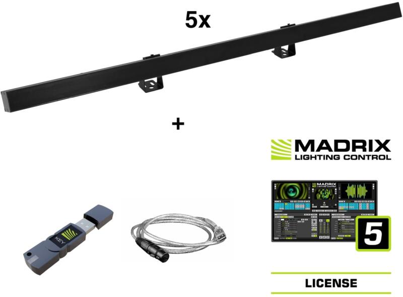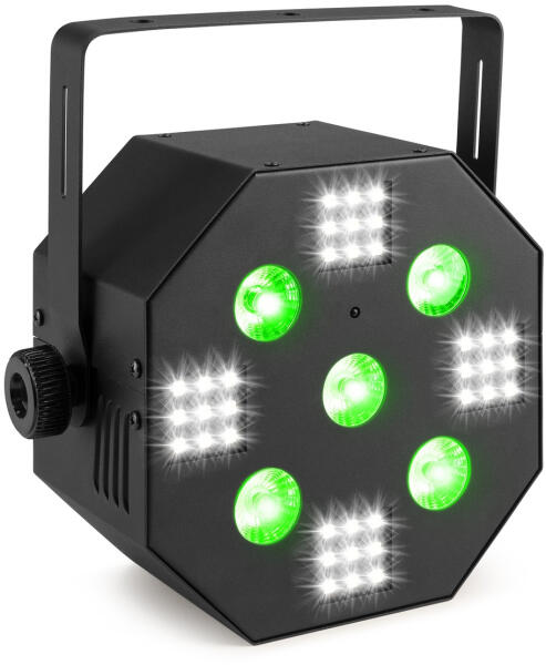 Műszaki adatok: - 2 az 1-ben effekt RGB-UV LED effekt + 4 stroboszkóp - LED-effekt 5x 4W-os RGB-UV LED-ekkel - 4 stroboszkópos egység, egyenként 9 fehér SMD LED-del - DMX és önálló üzemmód - 2, 4, 6 vagy 13 DMX csatorna - Master/slave funkció - Hang aktiválás állítható érzékenységgel - Automatikus üzemmód és előre programozott effektek - IR távirányító - DMX be-/kimene