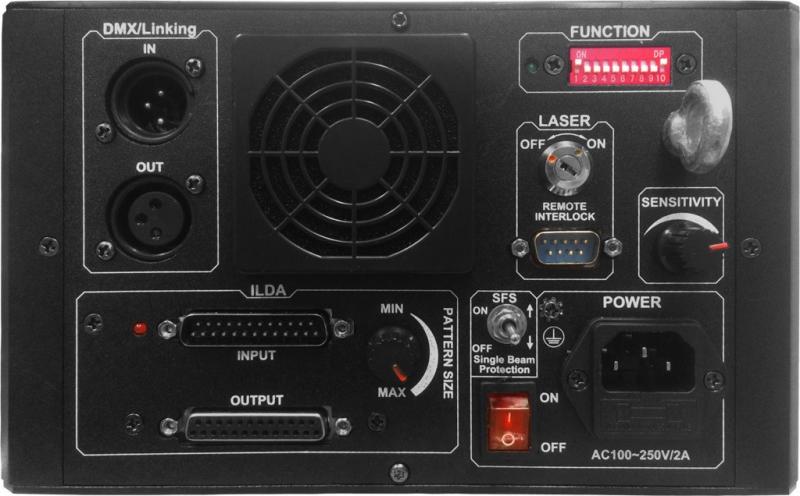 Lézer, RGB max. 1000mW, automata, hangvezérelt, DMX, ILDA, Galvo 30k Nagyteljesítményű, fél-profi lézer, erőteljes effektekkel – például beam, wave és tunnel – emellett alap grafikák megjelenítésének lehetőségével. A lézer plug & play üzembe helyezhető, rendelkezik hangvezérléssel (sound-to-light) és önálló (stand-alone) móddal. Támogatja a DMX vezérlést, íg