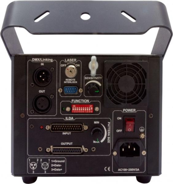 Lézer, RGB max. 2000mW, automata, hangvezérelt, DMX - Felhasználás: klub, disco, rendezvény, szabadtér - Összteljesítmény: max. 2000 mW - Lézersugarak színe: piros, zöld, kék - Vezérlés típusa: ILDA, DMX 512, hangvezérlés, automata - DMX csatornák száma: 11 db - Galvo eltérítés: 30 k - Diódák száma: 3 db - Diódák garantált teljesítménye: 1600mW (piros 250 mW, zöld 2
