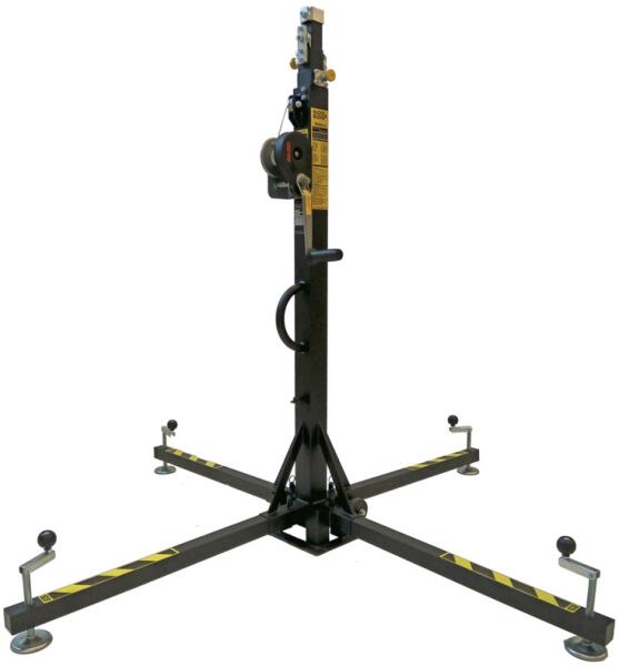 High-quality truss lift for loads up to 150 kg, made in EU Four-part telescopic ground support Safety bolts to lock the different sections at different heights Locking bolts in the base area to lock the booms Booms with adjustable spindle and steel plate with non-slip rubber base Corrosion protection through epoxy coating Water level to ensure a vertical position Earthing connection Transport roll