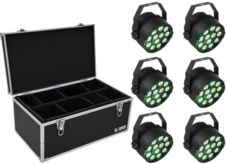 Az itt látható egyedi termékleírások és képek a DJSoundLight Kft tulajdonát képezik. 6x compact spotlight with 12 x 3 W 3in1 LEDs in RGB incl. universal caseEUROLITE LED PARty TCL SpotCompact spotlight with 12 x 3 W 3in1 LED in RGB and DMX control Equipped with 12 bright 3 W RGB LEDs (3in1) Built-in color change programs, strobe effect, pulse effect and dimmer Direct selection for 18 stat