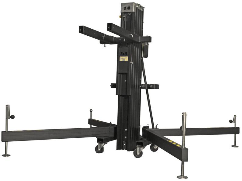 High-quality truss lift for loads up to 300 kg, made in EU Five-part telescopic ground support Safety bolts to lock the different sections at different heights Locking bolts in the base area to lock the booms Booms with adjustable spindle and steel plate with non-slip rubber base Corrosion protection through epoxy coating Water level to ensure a vertical position Earthing connection Transport roll