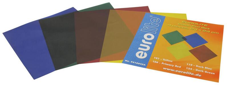 Az itt látható egyedi termékleírások és képek a DJSoundLight Kft tulajdonát képezik. High-quality color foils For adding color to a white beam Attached in color filter frames in front of halogene-spots Great variety of colors Dimensions 24 x 24 cm Precut for PAR 64 spot