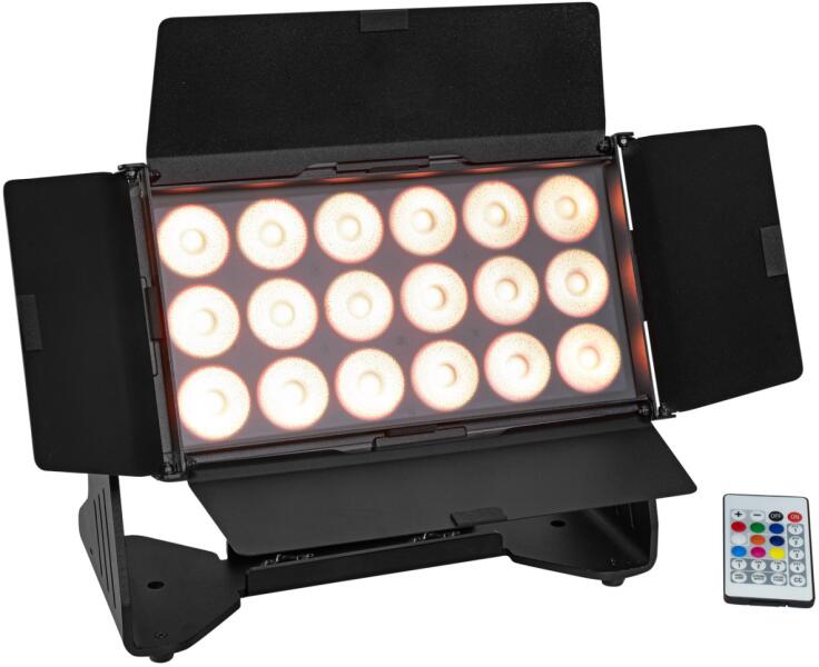 Silent IP65 LED floodlight with RGBW color mixing, CRMX, diffuser cover, barn doors, IR remote control Integrated wireless receiver for CRMX operation Silent operation Control via DMX; W-DMX by wireless solution; CRMX by LumenRadio; master/slave function; RDM; stand-alone; IR remote control Additional frost filter provides a wide, soft and homogeneous light 4 barn doors to avoid blinding the audie