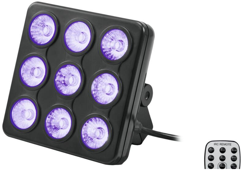 Infrared remote control for UV LED bar Comfortable addressing and setting Functions: dimming, strobe effect, Master/Slave Suitable for EUROLITE LED BAR-126 UV 10mm 15° incl. IR , EUROLITE LED BAR-252 UV 10mm 15° incl. IR, EUROLITE LED BAR-27 UV 27x1W 25° incl. IR, 51930308 EUROLITE LED UV Gun 60W COB incl. IR, 51930315 EUROLITE LED ML-30 UV 7x1W 12° incl. IR Controlling by IR remote control