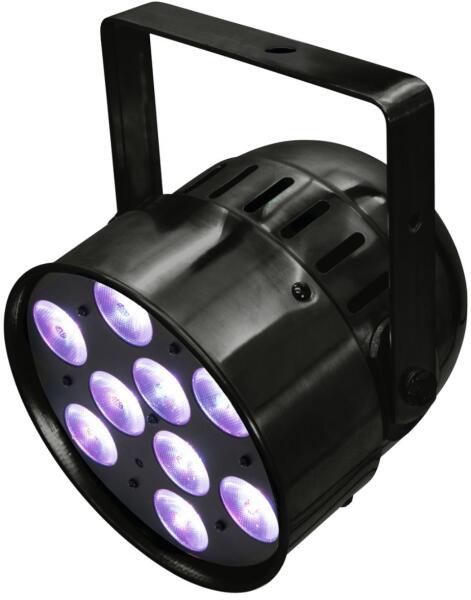 PAR-56 spot with 9 x 10 W 6in1 LED and RGBAW+UV color mixing 9 powerful LEDs 10 W high-power 6in1 HCL RGBWA/UV (homogenous color mix) Color change adjustable; Dimmer electronic; color blend stepless Strobe effect; UV effect The device is cooled by low-noise cooling fan Control via stand-alone; DMX; sound to light via microphone; IR remote control Flicker-free Wit h a beam angle of 20° With mounti