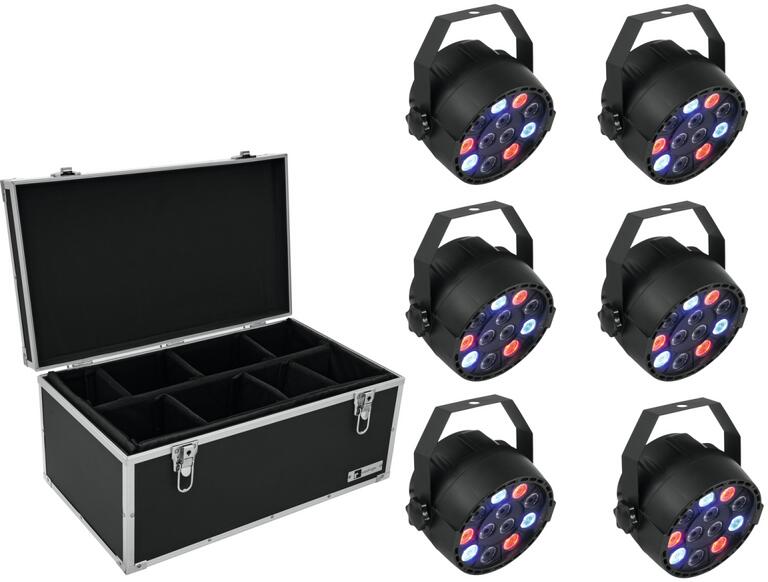 Az itt látható egyedi termékleírások és képek a DJSoundLight Kft tulajdonát képezik. 6x compact spotlight with 12 x 1 W LED in RGBW including universal caseEUROLITE LED PARty SpotCompact spotlight with 12 x 1 W LED in RGBW and DMX control Equipped with 12 bright 1 W LEDs - 3 x R, 3 x G, 3 x B and 3 x W Built-in color change programs, strobe effect, pulse effect and dimmer Direct selection