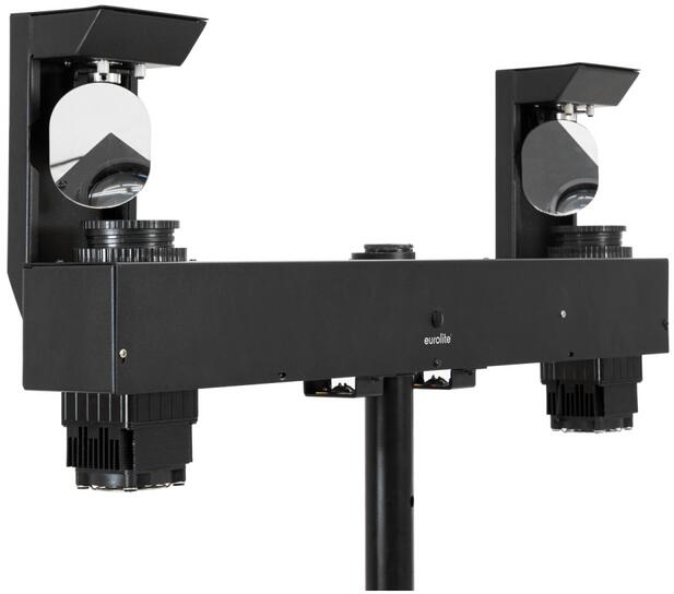 LED Scan Bar 2 szkennerrel, IR távirányító, szabványos hangfal vagy világítás állványra helyezhető, 2 full-fledged scanners in one bar Mirror movement can be inverted separately for both scanners (e. g. for common, counter-rotating control) Color and gobo selectable in standalone functions 16 built-in auto and music show programs Strobe effects with adjustable speed Random strobe effect