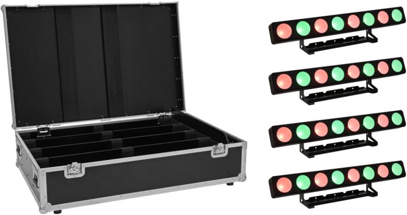 LED light effect bar with RGBW color mixing, incl. IR remote control EUROLITE LED PMB-8 COB QCL 30W Bar 8 powerful LEDs 30 W COB (chip-on-board) 4in1 QCL RGBW (homogenous color mix) Color blend stepless; color change adjustable; color fade adjustable; Dimmer electronic Strobe effect Integrated show programs Direct color selection for 27 preset colors The device is cooled by low-noise cooling fan C