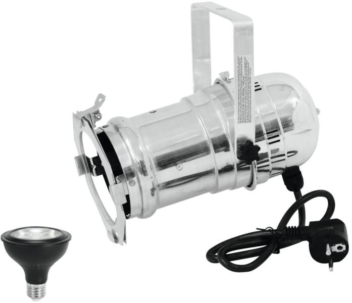 PAR-30 housing with E-27 socket including PAR-30 LED lamp with modern dim-to-warm-feature EUROLITE PAR-30 Spot silverPAR-30 housing with E27 socket (with plug + cable) 4 clip-to-hold clamps with spring locks for comfortable opening of the color filter frame Strong clamps with extension springs for safe hold and for quick opening of the rear housing cover Blackened tube for precise light output Sui