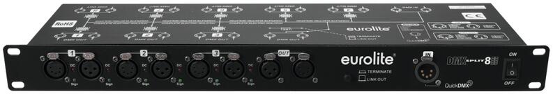 Az itt látható egyedi termékleírások és képek a DJSoundLight Kft tulajdonát képezik. Jellemzők: DMX splitter, 1 bemenetről 8 kimenetre osztja szét a jelet 1 db DMX bemenet, 1 db DMX átvezető (feed-through) kimenet, 8 db DMX kimenet QuickDMX bemeneti lehetőség, a vezetéknélküli DMX jelek fogadásához (önmagában a Split 8X nem képes vezetéknélküli jeleket fogadni) A bemenet