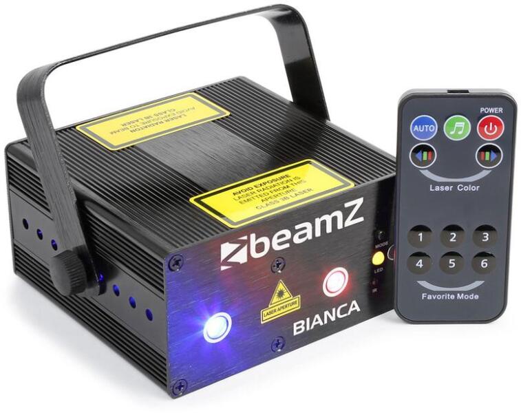 Az itt látható egyedi termékleírások és képek a DJSoundLight Kft tulajdonát képezik. A BeamZ Bianca RGB a gyártó egyik 3 diódás (zöld, piros, kék) lézere. Több előre programozott effektekkel amelyeket változtatgat és mozgat. Használhatjuk hangvezérlős módban ahol az érzékenység egy kis potméterrel állítható, létezik automata funkciója is amelyben az összes effekte