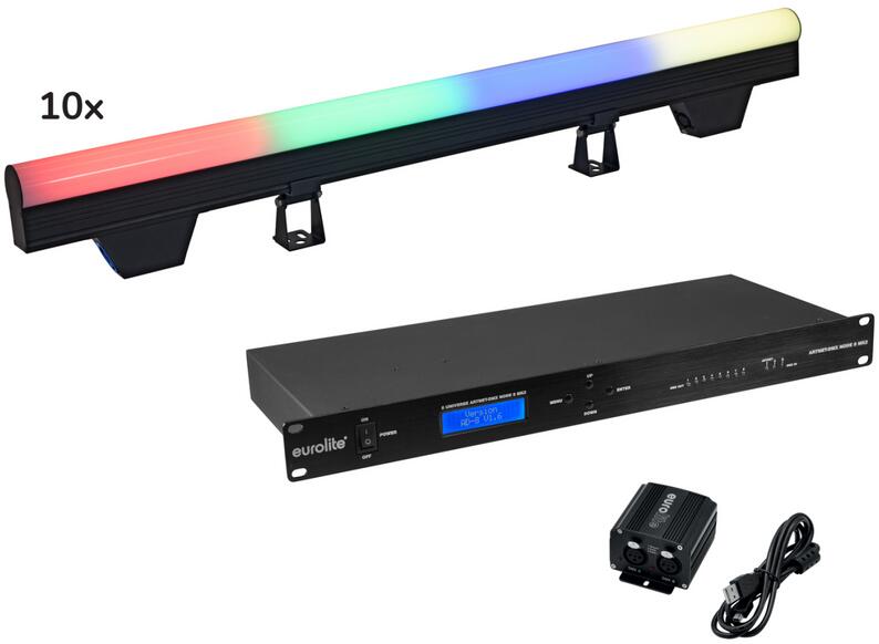 Termék részletekAz itt látható egyedi termékleírások és képek a DJSoundLight Kft tulajdonát képezik. 10x DMX-controllable pixel rail with RGB color mixing incl. USB interface and Art-Net interfaceEUROLITE LED PT-100/32 Pixel DMX TubeDMX controlled pixel tube with RGB color mixing Tube with 96 high-power RGB LEDs (3in1) for washlight effects Subdivided into 32 pixels (illumination units ŕ 3 LEDs) which c