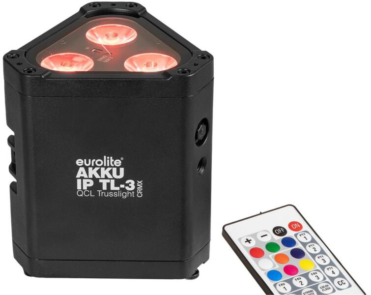 Weather-proof battery LED spot (IP65) ideal as trusslight or uplight with bright 3x10W RGBW LED Silent operation Control via stand-alone; master/slave function; IR remote control; DMX; CRMX by LumenRadio; W-DMX by wireless solution; RDM Integrated wireless receiver for CRMX operation 3 buttons on the remote control for saving your own settings Compact and bright 3 powerful LEDs 10 W 4in1 QCL RGBW