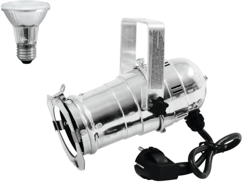 PAR-20 housing with E-27 socket including PAR-20 lamp EUROLITE PAR-20 Spot silverPAR-20 housing with E27 socket (with plug + cable) 4 clip-to-hold clamps with spring locks for comfortable opening of the color filter frame Strong clamps with extension springs for safe hold and for quick opening of the rear housing cover Blackened tube for precise light output Strong cable tension relief Control via