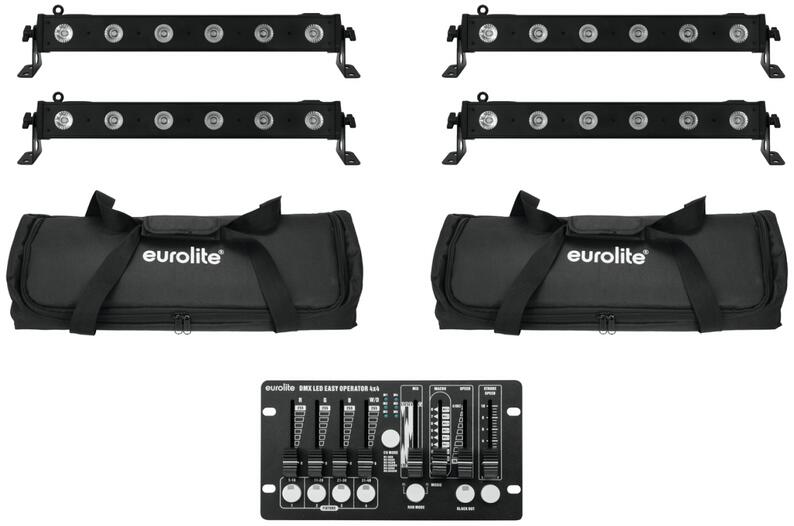 Az itt látható egyedi termékleírások és képek a DJSoundLight Kft tulajdonát képezik. 4x Spotlight bar with 6 x 4 W 4in1 LED including soft bag and compact DMX controllerEUROLITE LED BAR-6 QCL RGBW BarLED bar (60 cm) with 6 x 4 W 4in1 LED (RGBW) Operable in stand-alone mode or via DMX Microphone sensitivity adjustable via Control Board Supports QuickDMX - the wireless DMX system from Eurol