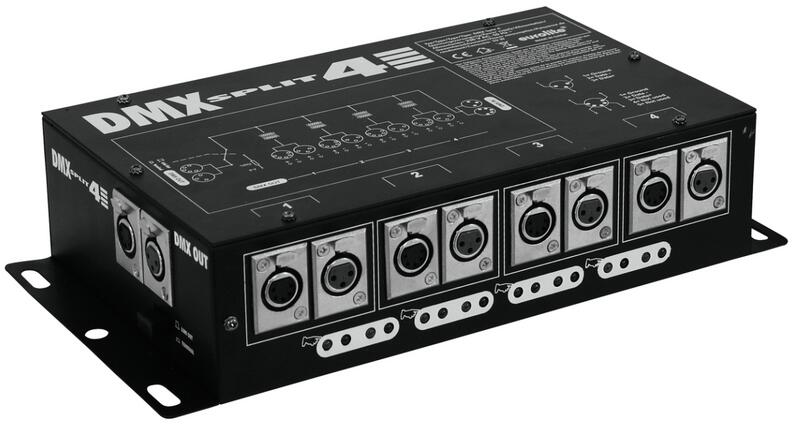 Az itt látható egyedi termékleírások és képek a DJSoundLight Kft tulajdonát képezik. Jellemzők: DMX splitter, 1 bemenetről 4 kimenetre osztja szét a jelet 1 db DMX bemenet, 1 db DMX átvezető (feed-through) kimenet, 4 db DMX kimenet A bemenet és a kimenetek galvanikusan elválasztottak 3 és 5 pólusú XLR csatlakozók Mindegyik XLR kimenet különálló driver, és állapot indikát