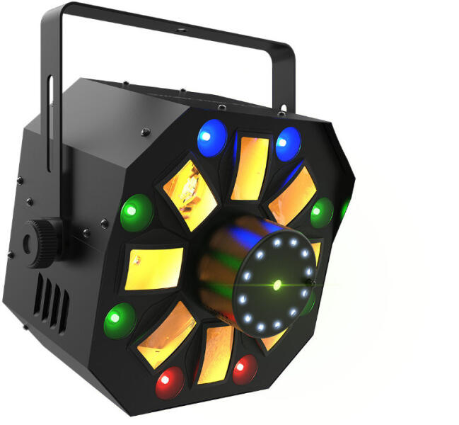 4 az 1-ben LED lámpa, amely egyesíti az RGBAW forgó derbit, az RGB+UV mosást, a piros/zöld lézert és a fehér SMD ...