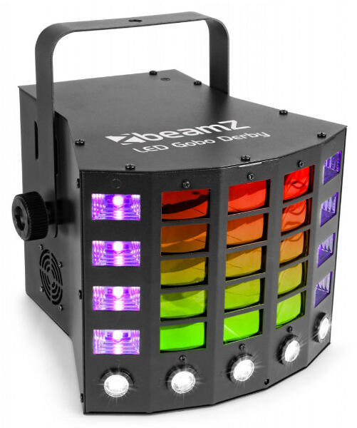 A Gobo Derby egy sokoldalú 3 az egyben készlet 8 x 3W RGBA LED-ekkel, 8 x 3W UV LED-ekkel és 5 ...