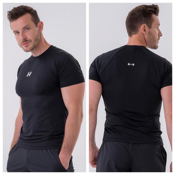 Funkcionális férfi slim fit póló a NEBBIA fitness márkától fekete színben fényvisszaverő logóval a NEXT LEVEL kollekcióból.
