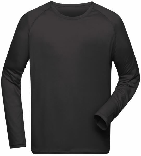 A férfi hosszú ujjú funkcionális sportpóló újrahasznosított poliészterből készült. Az anyag könnyű, gyorsan száradó, légáteresztő, nagyon kényelmes és elvezeti az izzadságot a testtől. A póló klasszikus kerek nyakkivágással és raglan ujjakkal rendelkezik. A póló hátsó része texturált és még légáteresztőbb. A vállakon fényvisszaverő nyomatok vannak a jobb l