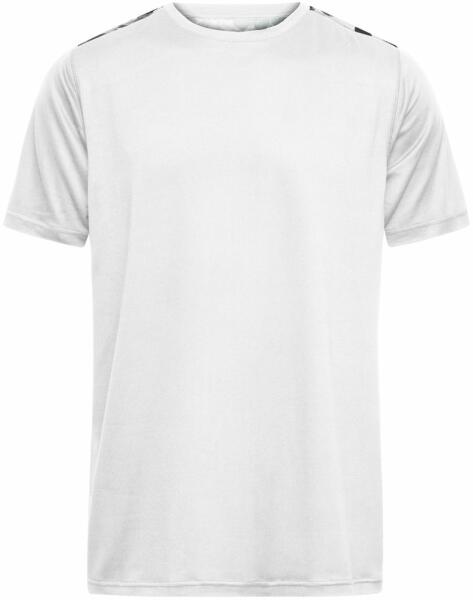 Könnyű és kényelmes férfi funkcionális rövid ujjú sport póló újrahasznosított poliészterből. Kellemesen légáteresztő és gyorsan száradó anyagból készül. Klasszikus kerek nyakkivágással, valamint a váll felső és hátsó részén dizájnos nyomtatással. Újrahasznosított poliészter - újrahasznosított PET palackokból készül - őrlik, megolvasztják, majd szálakká