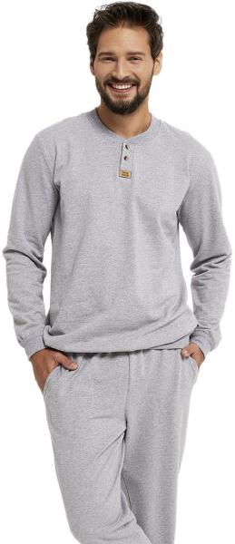 Anyag: 100% pamut Kiváló minőségű pamut kötött tréningruha anyag Gombos nyakkivágás Praktikus szalagozás az ujjakon, a lábakon és a pulóver alján Kényelmes oldalsó zsebek a nadrágban Dekoratív tapasz a gyártó logójával Praktikus melange szín Ideális otthoni viseletként Lengyelországban tervezett és varrt termék A cikket M-2XL méretben állították elő