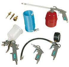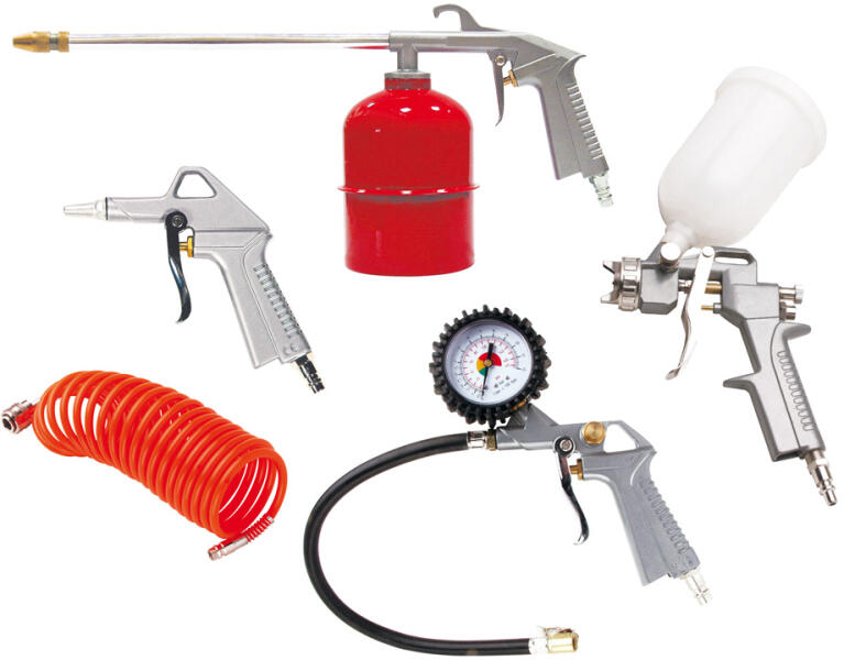 Nu Air Levegős festékszóró pisztoly készlet 5 részes kiszerelésben Tulajdonságok: Csatlakozások: 1/4" BSP Több célra használható fényezők körében elterjedt 5 része készlet Levegőfújó: 15 Bar-ig skálázott manométer órával, Szürke sima felületű erős ház Gumi tömlő: Narancssárga spirál tömlő műanyag tömlő, réz gyors csatlakozóval Festékszóró pisztoly műa