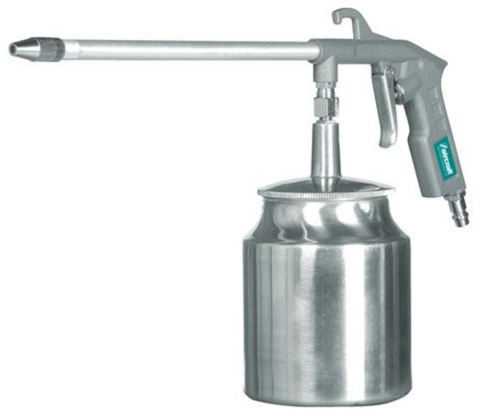 Alumínium SPA szórópisztoly - tömlővéges (gyorscsatlakozó ellendarab) - 1 l-es alumíniumtartállyal - hideg tisztítószerek, mosószerek, olaj-spray-k permetezése Tömege: 0,46kg Levegőmennyiség szükséglet: 200 l/perc Levegő nyomás: 4-6bar