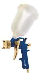 Professzionális modell praktikus, öntött alumínium pisztolytesttel, 600 cm³-es nejlon áramlási tartály, fokozatmentes festék-, levegőmennyiség- és sugárszélesség-szabályozás, levegőfogyasztás: 150 - 250 l/min, üzemi nyomás: 4 - 8 bar, 1,5 mm-es rozsdamentes acél fúvókakészlettel.
