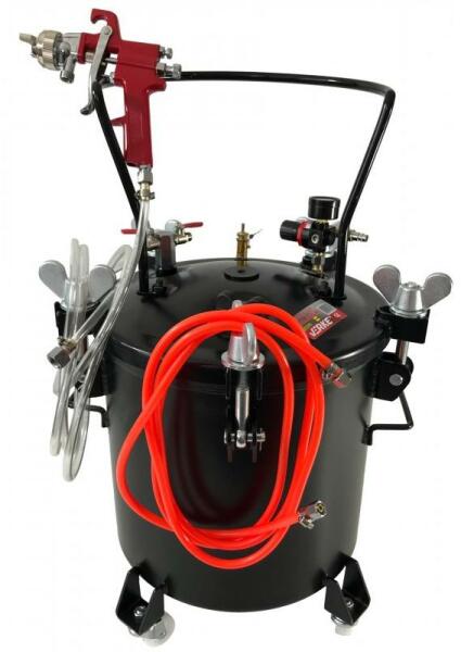 A termék jellemzői: kényelmes festés folyamatos festék hozzáadása nélkül 20 literes tartály lehetővé teszi a ragasztók gyors és tiszta felhordását, kiszáradás nélkül kétirányú légcsökkentő a tartály belsejében lévő nyomás szabályozására tömlőkészlet a pisztoly és a tank összekapcsolásához festékszóró pisztoly 2,0 mm-es fúvókával a tartályt korrózió