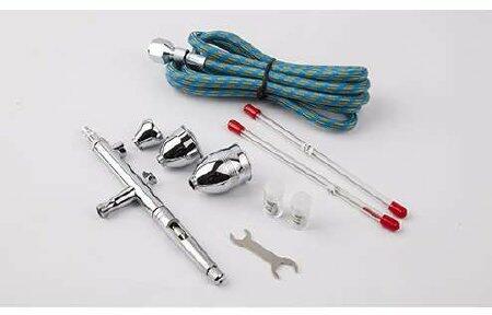 Airbrush specifikációk: Adagolás típusa: gravitáció Szerelt tű: 0,5 mm extra tű: 0,3 mm és 0,8 mm Szerelt fúvóka: 0,5 mm extra fúvóka: 0,3 mm és 0,8 mm Metal Cup kapacitás: 2 cm3 & 5cc & 13 cm3 Légtömlő: 1.8mt (6ft) Adapter: G1 / 8 MALE-G1 / 4 Femal Üzemi nyomás: 15-50psi
